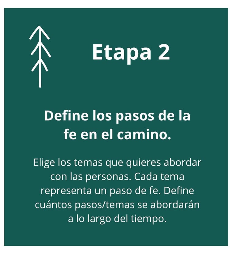 La ruta está compuesta por pasos en la fe que queremos animar a las personas a dar. Cada paso es un tema clave que trabajamos con las personas a lo largo de un período determinado.