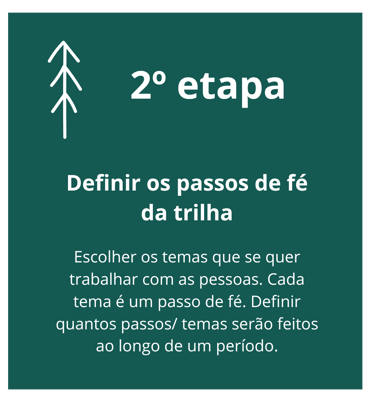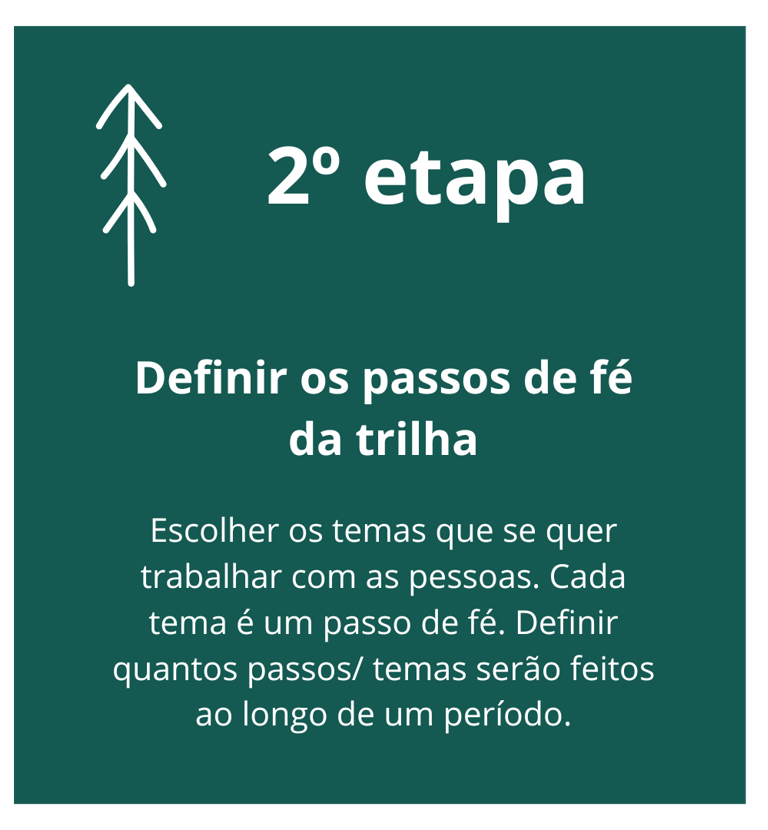 A trilha é composta de passos na fé que queremos estimular as pessoas a darem. Cada passo é um tema chave que trabalhamos com as pessoas ao longo de um período.